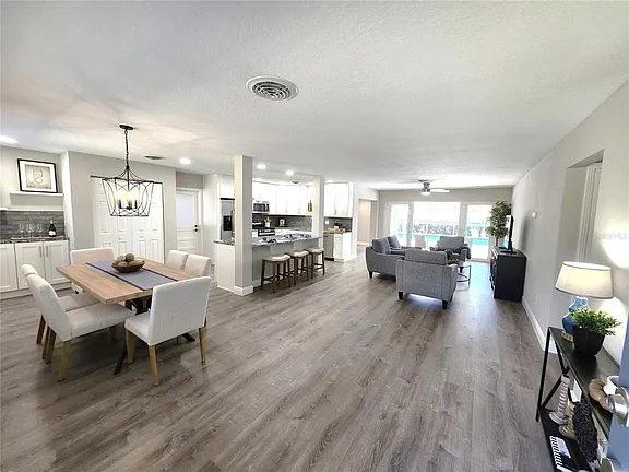 In a setting amongst the beautiful oaks of Temple Terrace , with the Hillsborough River and the Temple Terrace Golf and Country Club in close proximity, this home defines luxury. Walking into this home you immediately notice the 30 ft ceilings with wood tongue and groove craftsmanship. The open floor plan with the living room and dining room combo overlook a beautiful pool area with lots of space for entertaining. The master bedroom is a true retreat, complete with walk-in closets and an updated master bathroom featuring a stand-up shower and a luxurious jacuzzi tub. An additional oversized bedroom on the ground level opens up to one of the three outdoor entertaining spaces through sliding doors, providing a perfect blend of indoor and outdoor living. The open floor plan is designed to impress, highlighted With an updated kitchen sure to please any chef, the kitchen features an eat-in breakfast nook and bar seating. This phenomenal home also includes two fireplaces, perfect for cozy evenings. Step outside to the screened-in outdoor area where you’ll find a heated, saltwater pool with a beach shelf and a waterfall spa, making it an ideal spot for relaxation and entertainment. With three separate outdoor entertaining areas, a fully fenced yard, and tons of storage, this home is perfect for both quiet family time and lively gatherings. Upstairs, an incredible loft overlooks the pool and living space, leading to two more generously sized bedrooms, each with its own loft area. Additional features include a new roof installed in 2023, a reverse osmosis system, water softener, an updated master bathroom with a spa tub, a Bluetooth intercom stereo system throughout the home, and ample storage space. The oversized 2.5 car garage has plenty of space for two cars plus a golf cart. Temple Terrace allows golf carts to be driven on the street one of the few communities that allow this. Within walking distance is the Temple Terrace family Recreation complex one of the nicest in Tampa featuring activities for youth up to elder adults. Located just minutes from USF, Busch Gardens, I-75, I-4, hospitals, Ybor City, and Downtown Tampa, this home offers convenience and accessibility to some of the best attractions and amenities in the area. Schedule a private showing today and experience the perfect blend of luxury, comfort, and convenience!